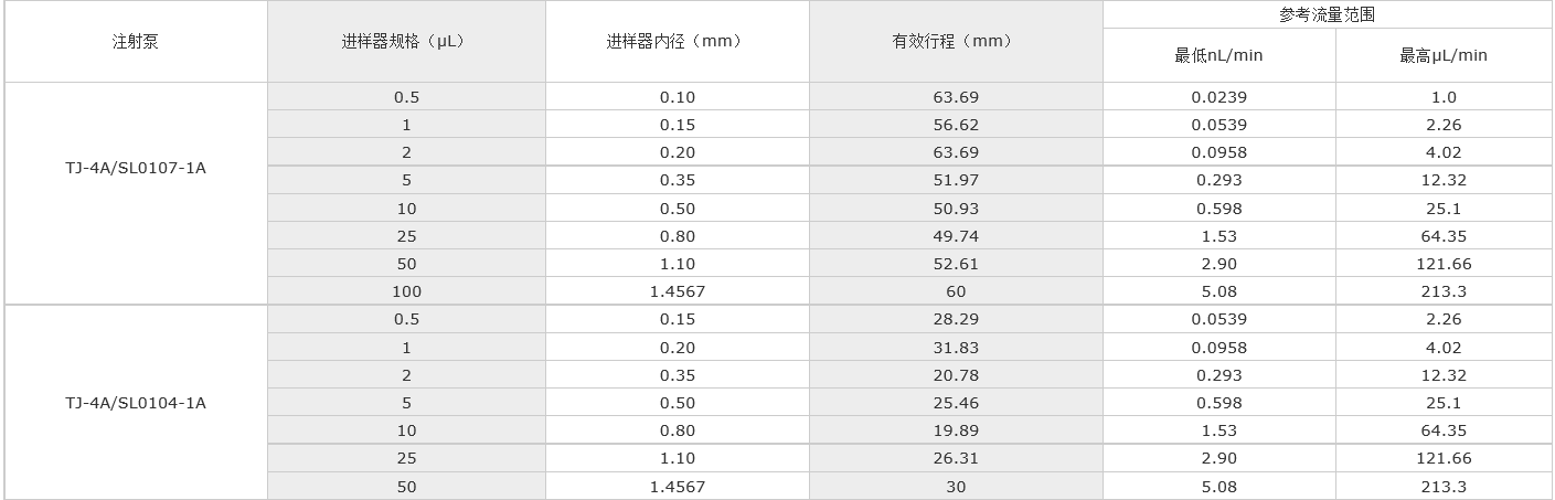 3.048μm/min-128.016mm/min(流量=線速度×注射器內(nèi)截面積) |