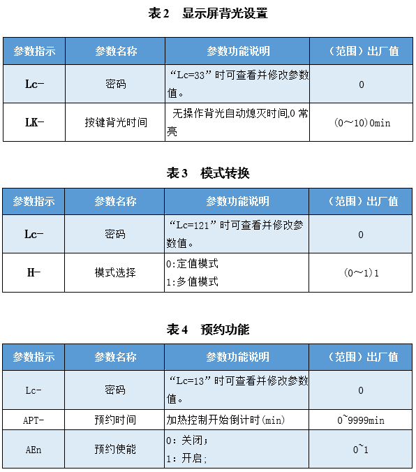 長按“設(shè)定”鍵,輸入密碼“13”,顯示“APT-”后設(shè)定預(yù)約時間,再點擊“設(shè)定”鍵,顯示預(yù)約開關(guān)“AEn”,輸入“0”表示關(guān)閉預(yù)約,輸入“1”表示開啟預(yù)約,再次點擊“設(shè)定”鍵退出后自動進入預(yù)約倒計時,時間到后進入溫度控制。